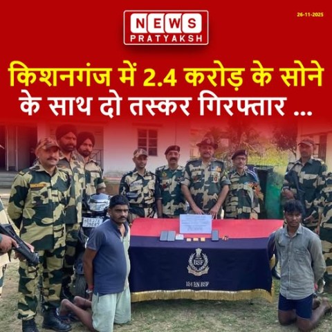 बिहार के किशनगंज में सीमा सुरक्षा बल (BSF) मुख्यालय के अधीन 184वीं बटालियन के जवानों ने एक बड़ी कार्रवाई करते हुए, पश्चिम बंगाल बॉर्डर और बिहार के किशनगंज स्थित कैल्टेक्स चौक से 2.4 करोड़ रुपये मूल्य के सोने के साथ दो तस्करों को गिरफ्तार किया है. गिरफ्तार