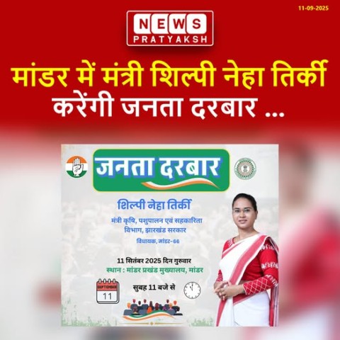 जनता दरबार मांडर में मंत्री शिल्पी नेहा तिर्की करेंगी जनता दरबार, समस्याओं का होगा समाधान मांडर : झारखंड सरकार की कृषि, पशुपालन एवं सहकारिता मंत्री शिल्पी नेहा तिर्की 11 सितंबर 2025, दिन गुरुवार को मांडर प्रखंड मुख्यालय में जनता दरबार आयोजित करेंगी। जनता दरबार सुबह 11:00 बजे से शुरू होगा, जिसमें क्षेत्र की जनता अपनी समस्याएँ सीधे मंत्री के समक्ष रख सकेंगी। मंत्री द्वारा मौके पर समस्याओं का समाधान करने का प्रयास किया जाएगा। इस पहल से लोगों को अपनी बात सीधे सरकार तक पहुँचाने का अवसर मिलेगा और स्थानीय मुद्दों के त्वरित निपटारे की उम्मीद जताई जा रही है।