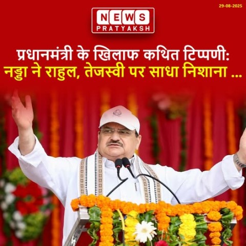 बिहार: दरभंगा में कांग्रेस नेता राहुल गांधी की ‘वोटर अधिकार यात्रा’ के दौरान प्रधानमंत्री नरेन्द्र मोदी के खिलाफ अभद्र भाषा का इस्तेमाल किये जाने का आरोप लगाते हुए भारतीय जनता पार्टी अध्यक्ष जे पी नड्डा ने बृहस्पतिवार को कांग्रेस नेता राहुल गांधी और राजद नेता तेजस्वी यादव पर निशाना साधा। नड्डा ने एक वीडियो संदेश जारी कर गांधी और तेजस्वी यादव को ‘दो बिगड़ैल राजकुमार’ कहा, जिन्होंने बिहार और इसकी संस्कृति को बदनाम किया है। भाजपा अध्यक्ष ने कहा कि दोनों नेताओं को देश से माफी मांगनी चाहिए।
